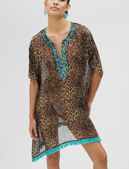 • Dettagli ricamati in blu turchese e frange