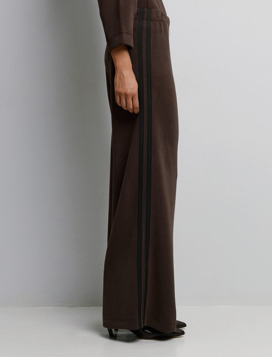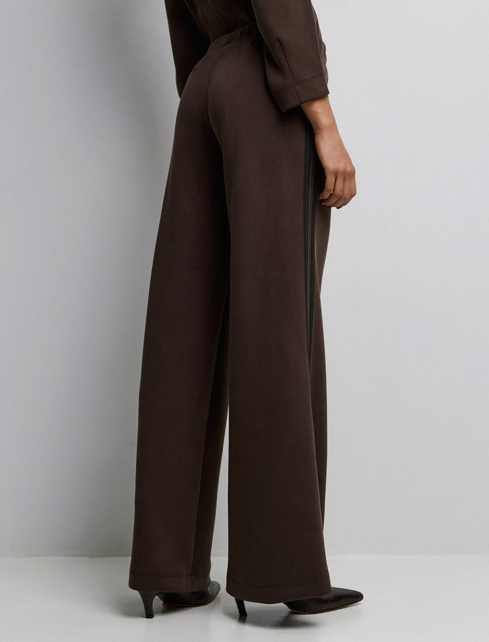 Questi pantaloni a gamba larga combinano eleganza rilassata e praticità quotidiana. La vestibilità fluida e il tessuto elastico garantiscono libertà di movimento, mentre le rifiniture a righe sui lati aggiungono un tocco distintivo al design.