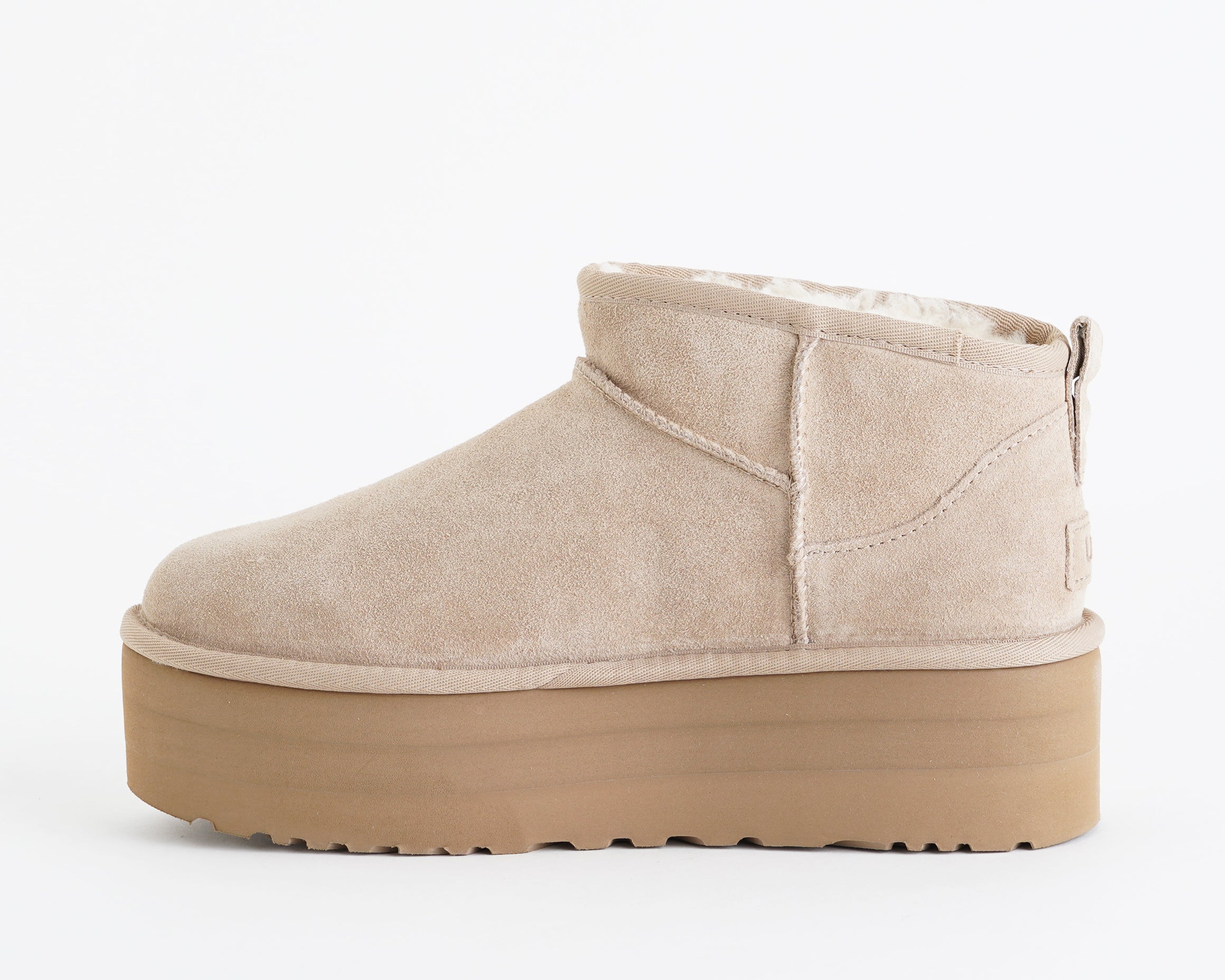• Logo UGG®, etichetta in pelle scamosciata sul tallone in rilievo