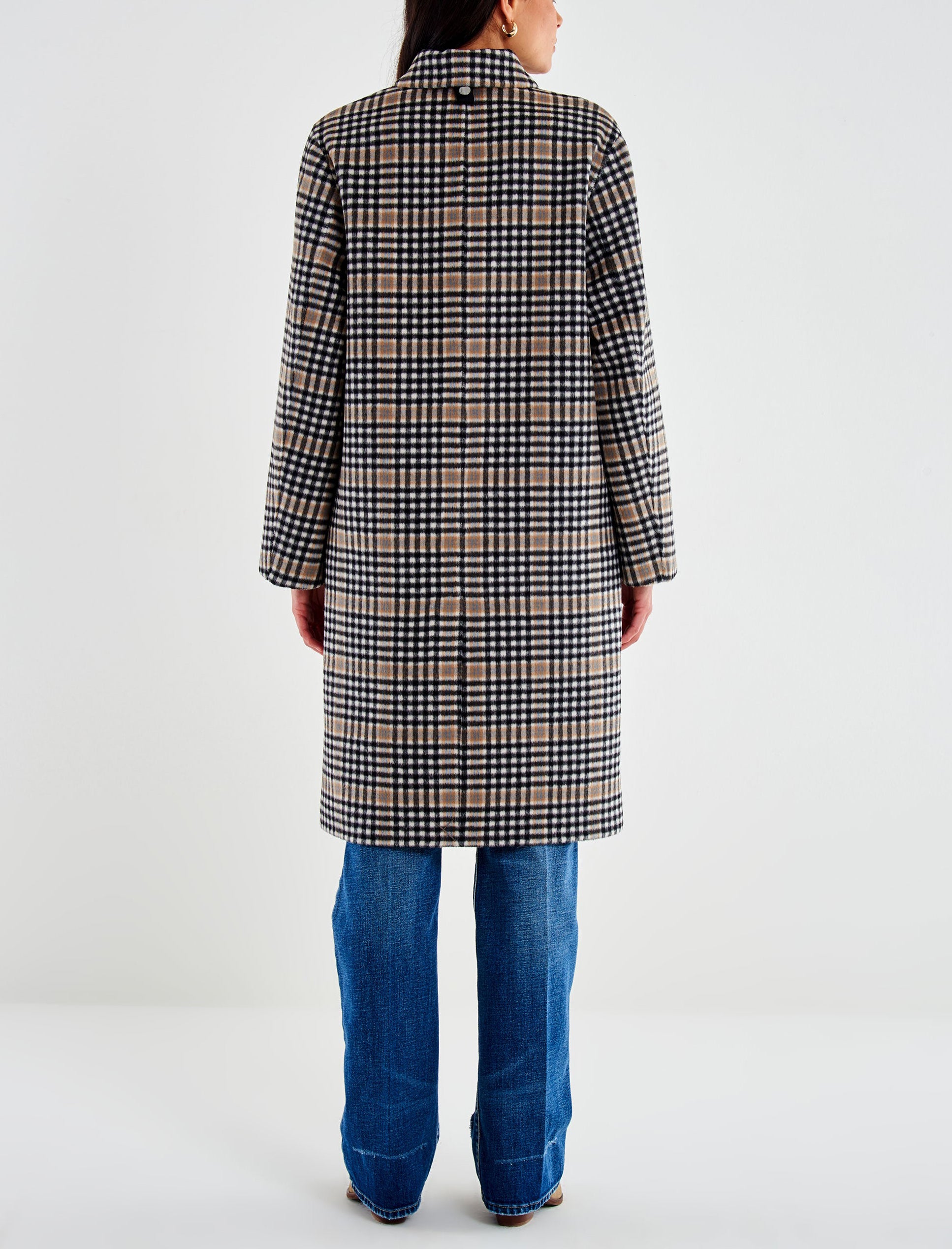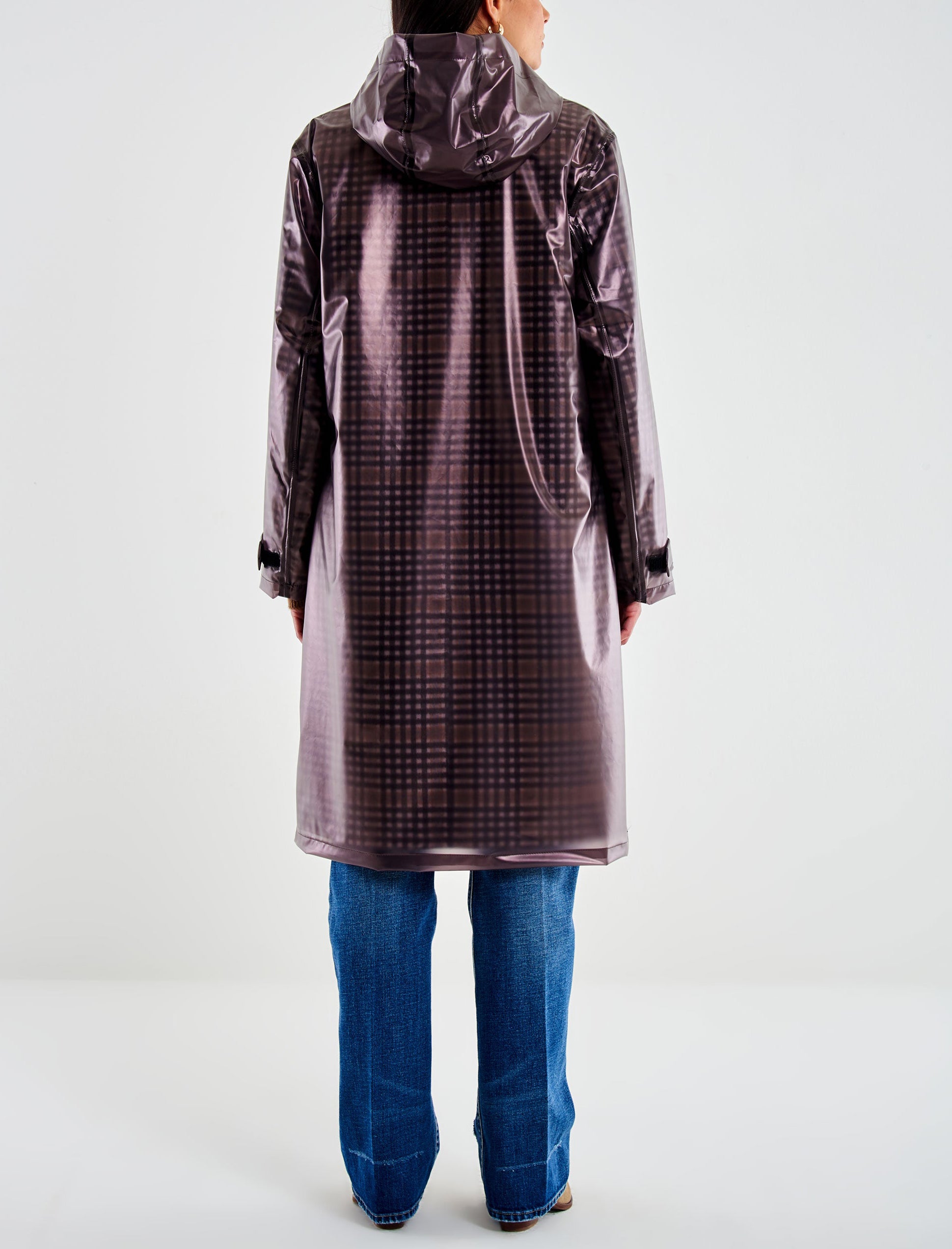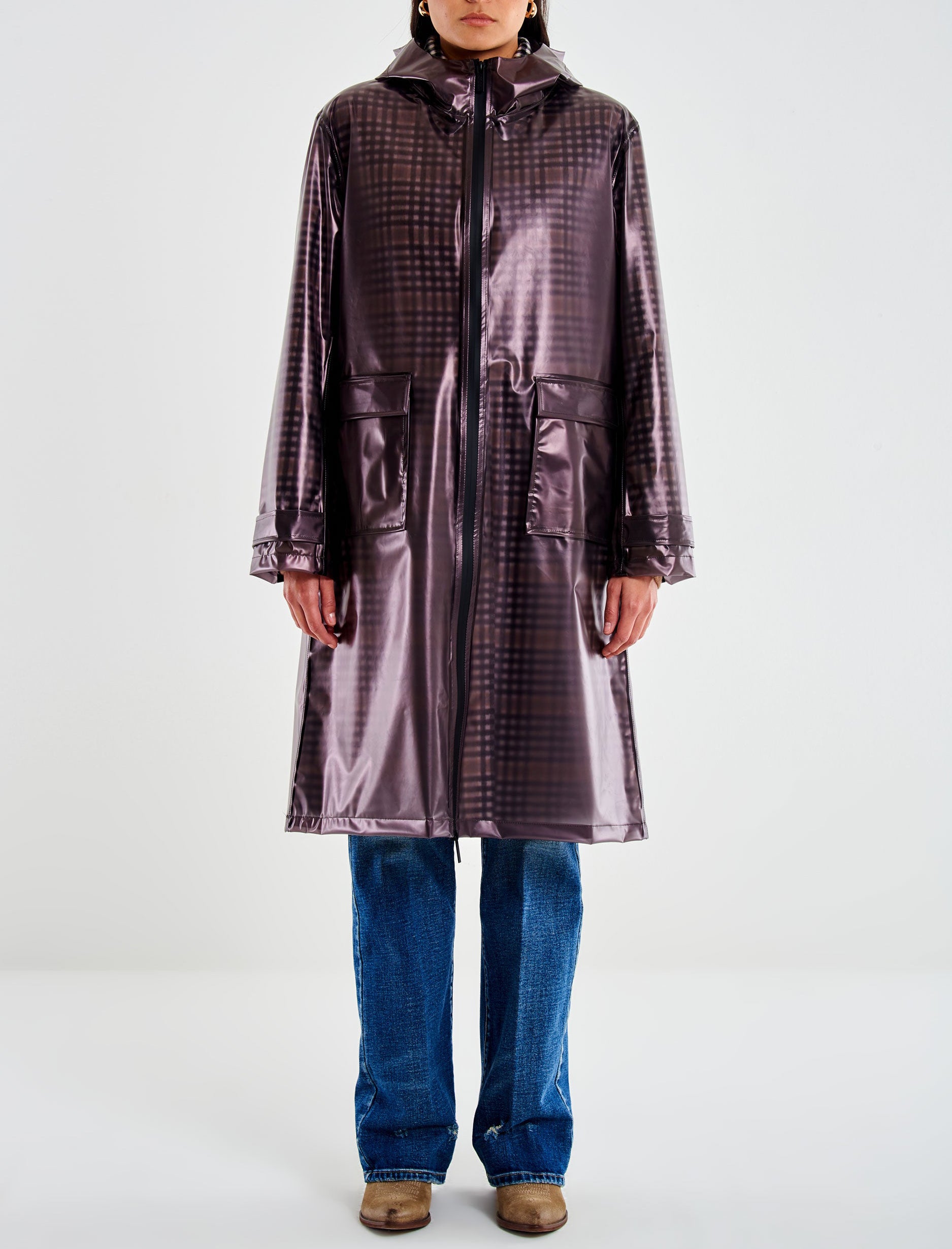 Cappotto lungo a quadri maniche lunghe con colletto. Chiusura frontale monopetto. Tasche frontali a pattina applicate. Spacco sul retro. Dettaglio impermeabile con cappuccio, con chiusura frontale con cerniera e tasche frontali con patta combinato. I due capi non sono vendibili separatamente.