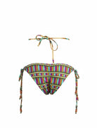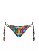 Scopri lo slip bikini brasiliana Miss Bikini con elegante motivo lance turchese e dettagli di palline etniche. Questo costume da bagno donna combina stile esotico e comfort per un look da spiaggia unico e raffinato.