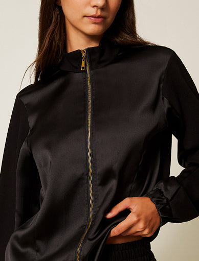Questo completo in maglia alla moda con dettagli in raso è l'incarnazione dell'eleganza sportiva. Il tessuto morbido veste comodamente, mentre gli inserti in raso aggiungono una delicata lucentezza e femminilità. I pantaloni e il bomber creano una silhouette armoniosa. Questo completo è perfetto sia per una giornata attiva che per un'uscita elegante.