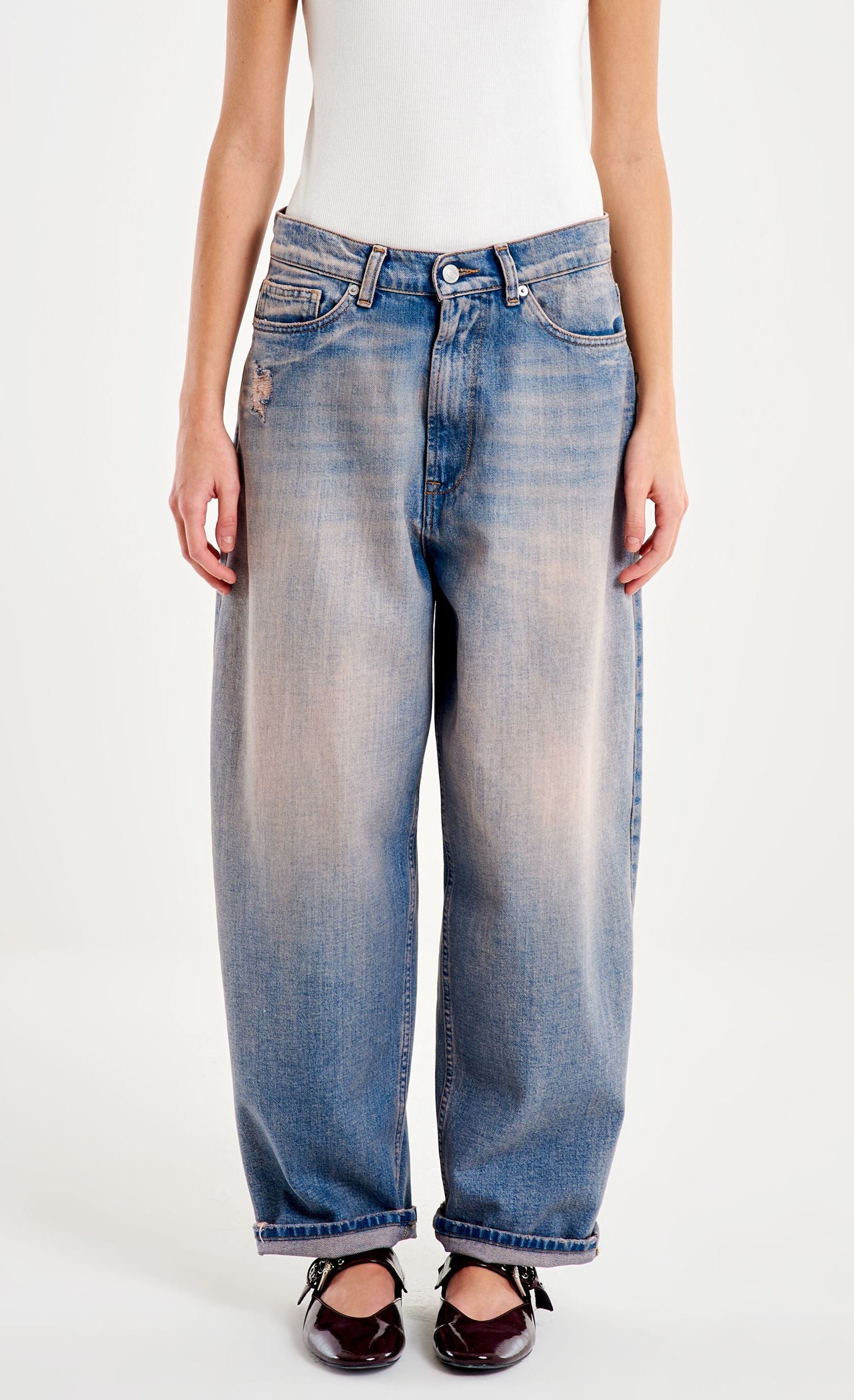 Jeans Lalia relaxed fit. Modello cinque tasche. Chiusura con cerniera e bottone di metallo. Dettaglio effetto vintage con mini rotture frontali e posteriori, e risvolto.