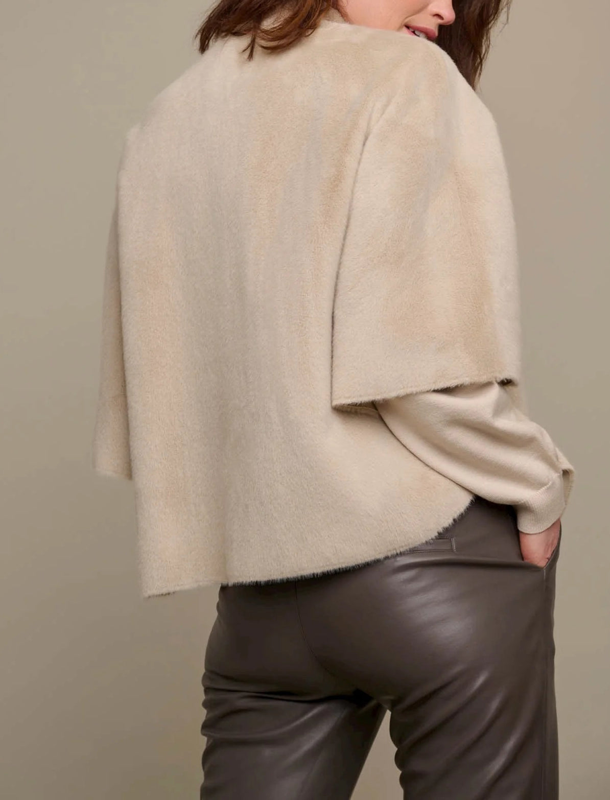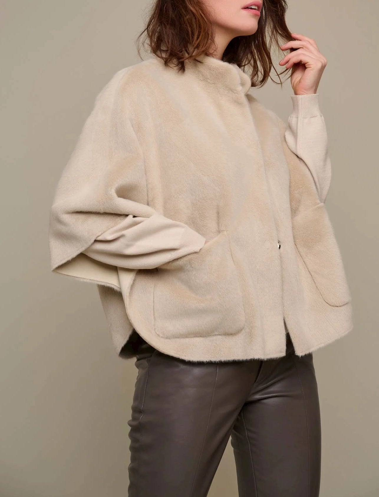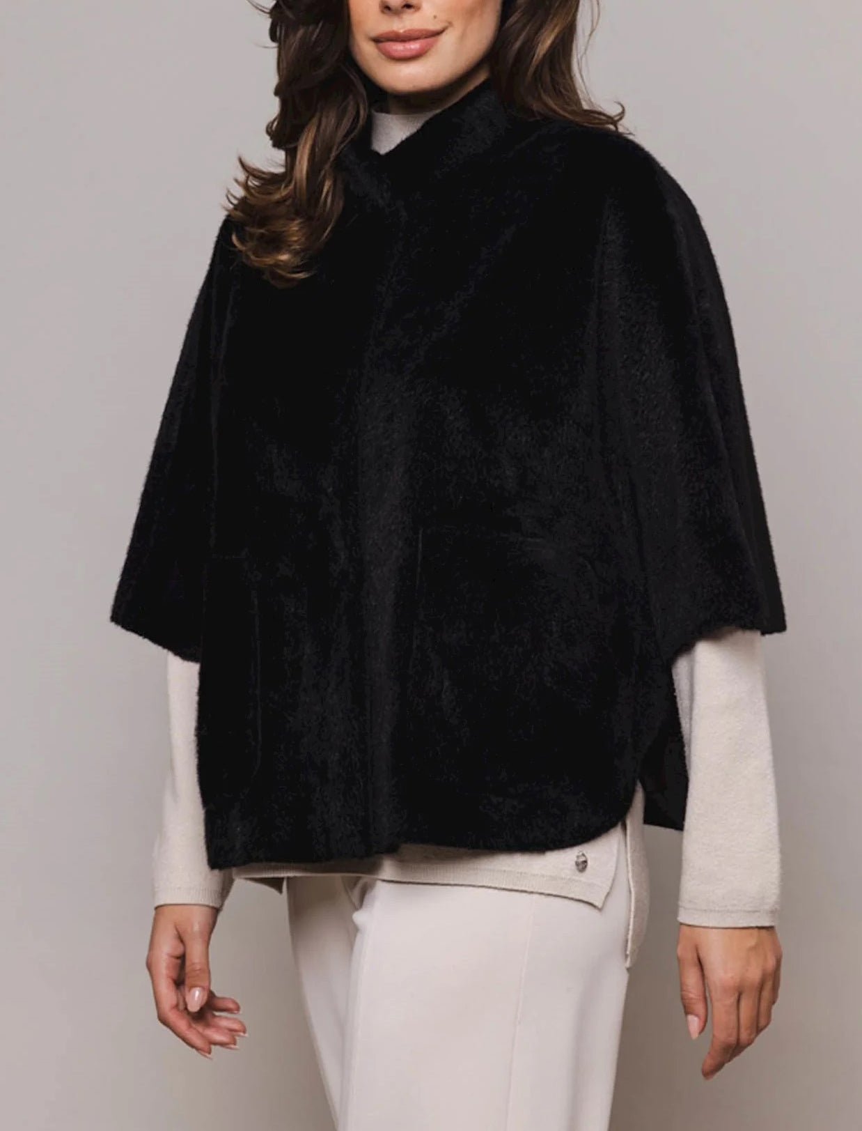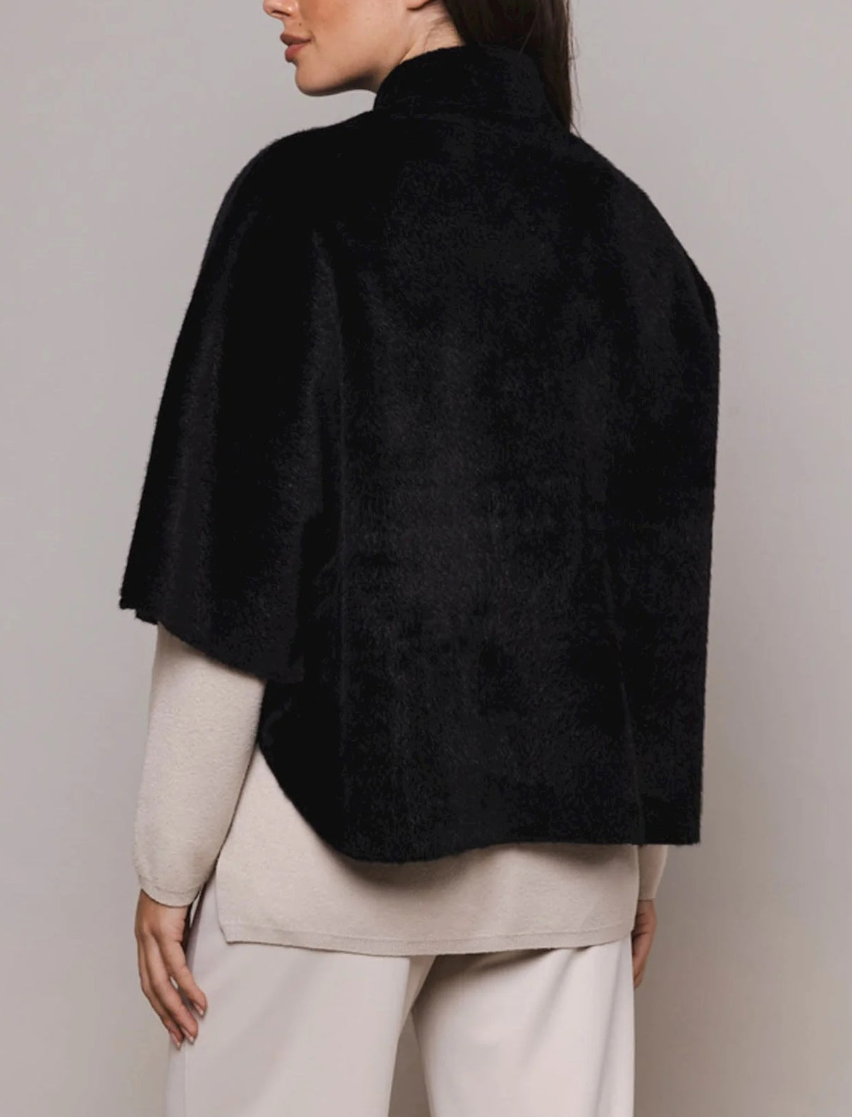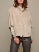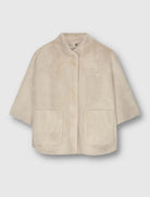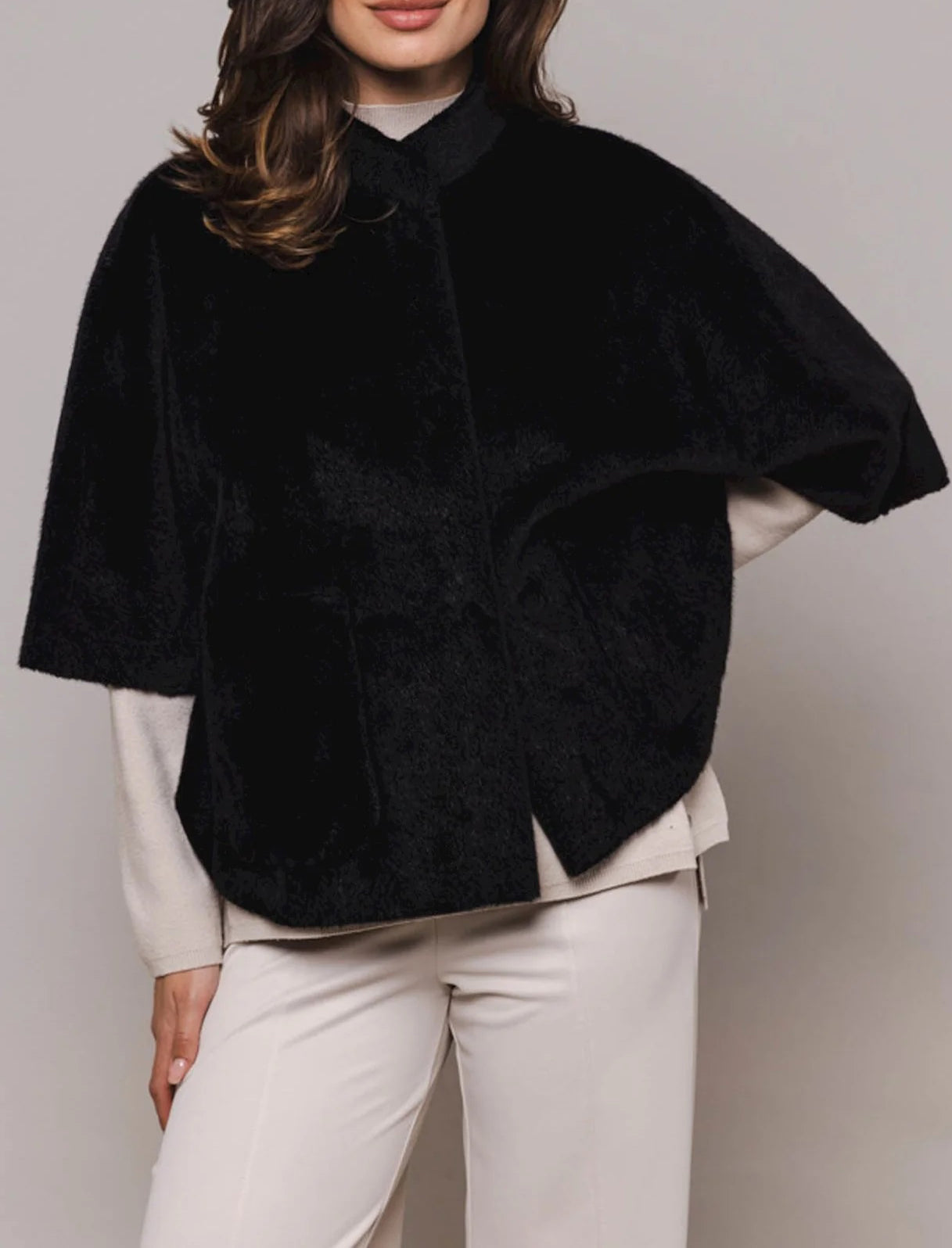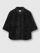 Questo mantello presenta due tasche frontali aperte, chiusura con bottoni automatici sul davanti, maniche corte e dettagli a fessura su entrambi i lati.