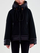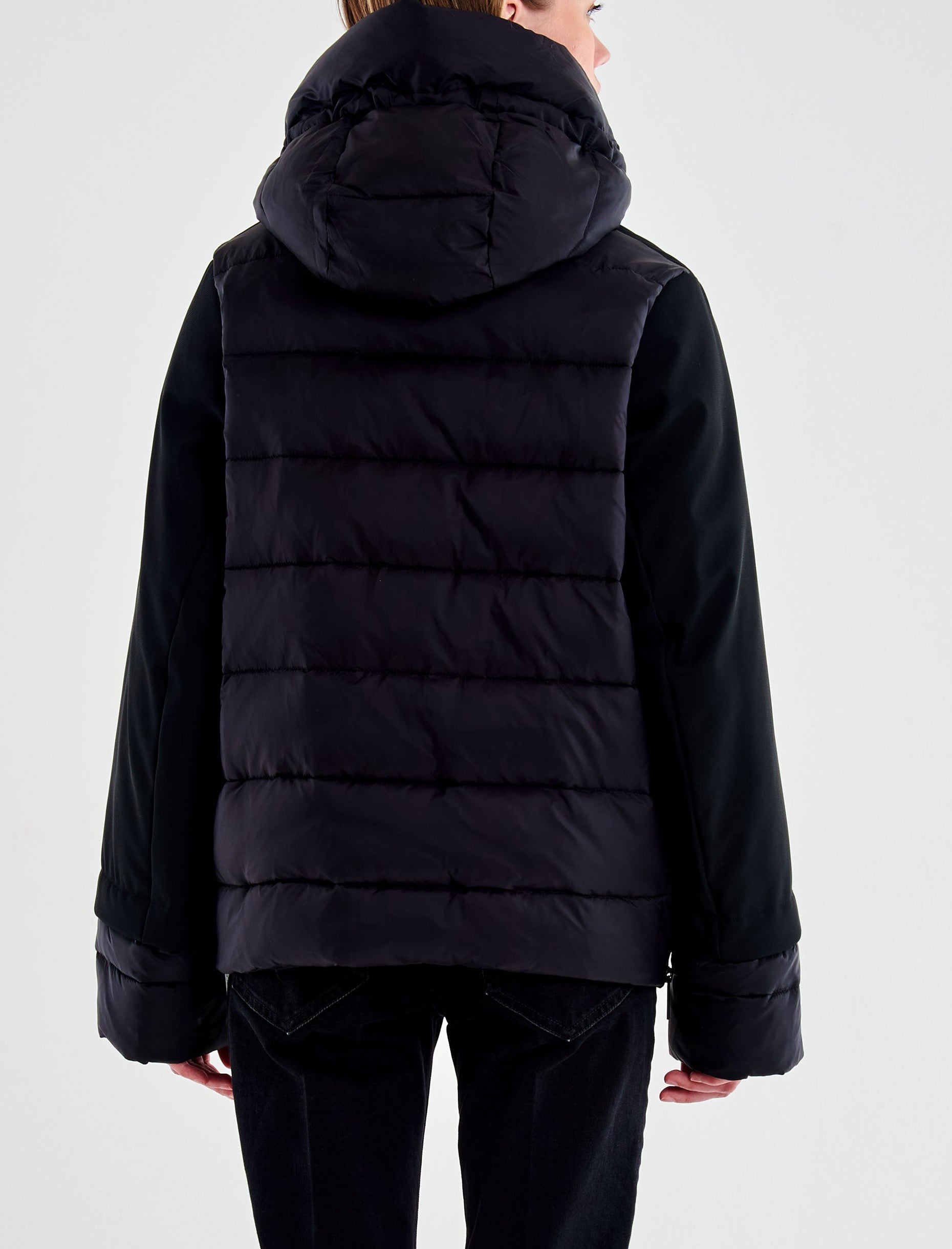 Piumino cropped maniche lunghe con cappuccio. Imbottito combinato con tessuto tecnico. Chiusura frontale con cerniera. Tasche alla francese con zip. Cappuccio con piumino con corda.